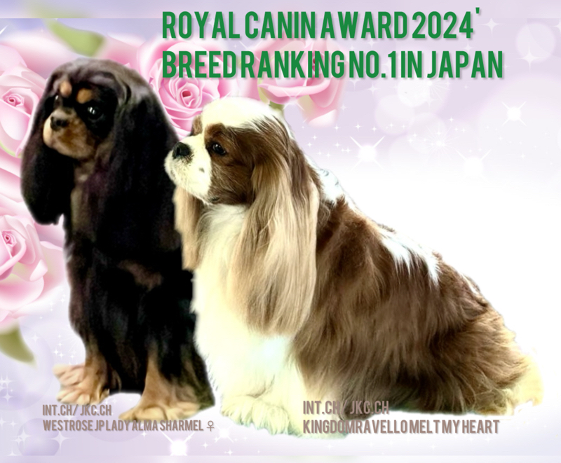 アルフィーは、スペインよりお迎えし、その美しさを高く評価頂き、キャバリア雄部門において、ジャパンランキングNo. 1である、ロイヤルカナンアワード 2024'を受賞する事ができました。